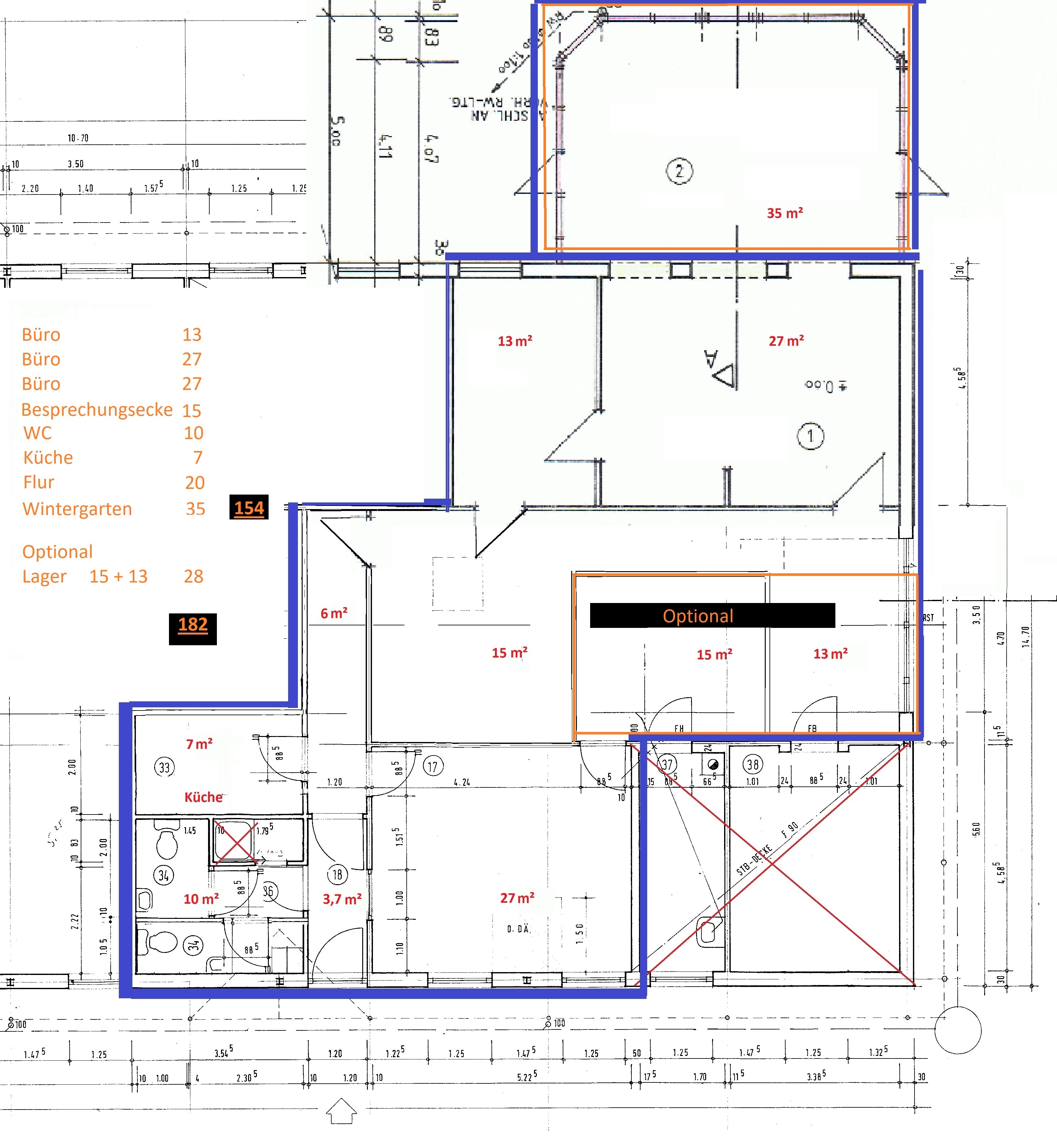 Ein Eingangsbereich, Büroräume, getrennte WC-Räume und einer Küche.